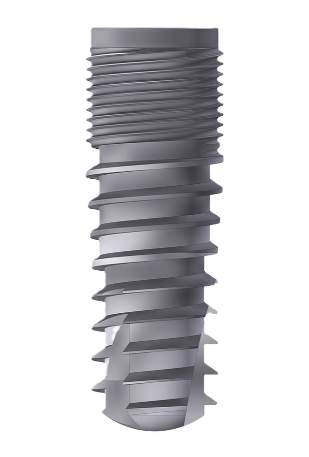 Das Feingewinde im oberen Bereich gewährleistet eine reduzierte Wärmeentwicklung während der Insertion sowie eine exzellente Primärstabilität. Kompressions- und Schneidgewinde im apikalen Bereich gehen harmonisch ineinander über und erreichen eine optimale Verdichtung der Spongiosa.