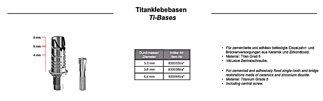 Die ixx2 CAD/CAM – Titanklebebasis wird inklusive der Zentralschraube geliefert und ist in Verbindung mit dem Scanbody für den Einsatz in der digitalen Kronen- und Brückenversorgung entwickelt worden. Sie ist in den Durchmessern 3,3; 3,8 und 4,4 erhältlich.