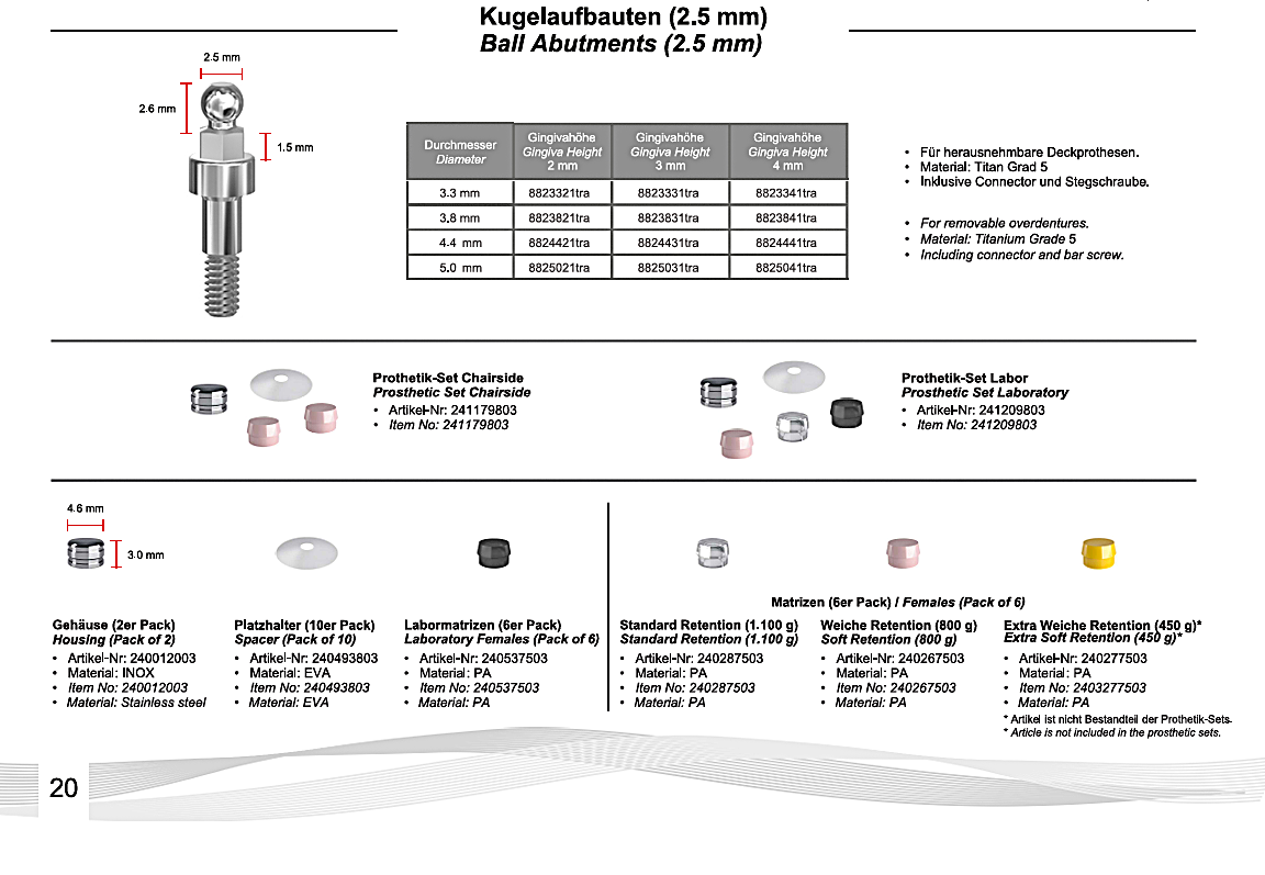 Die Prothetiksets sind für die Versorgung eines Kugelankers zusammengestellt und wahlweise für die „chairside“ Einarbeitung der Matrizen am Behandlungsstuhl, oder auch inkl. einer Arbeitsmatrize für das Dentallabor erhältlich.