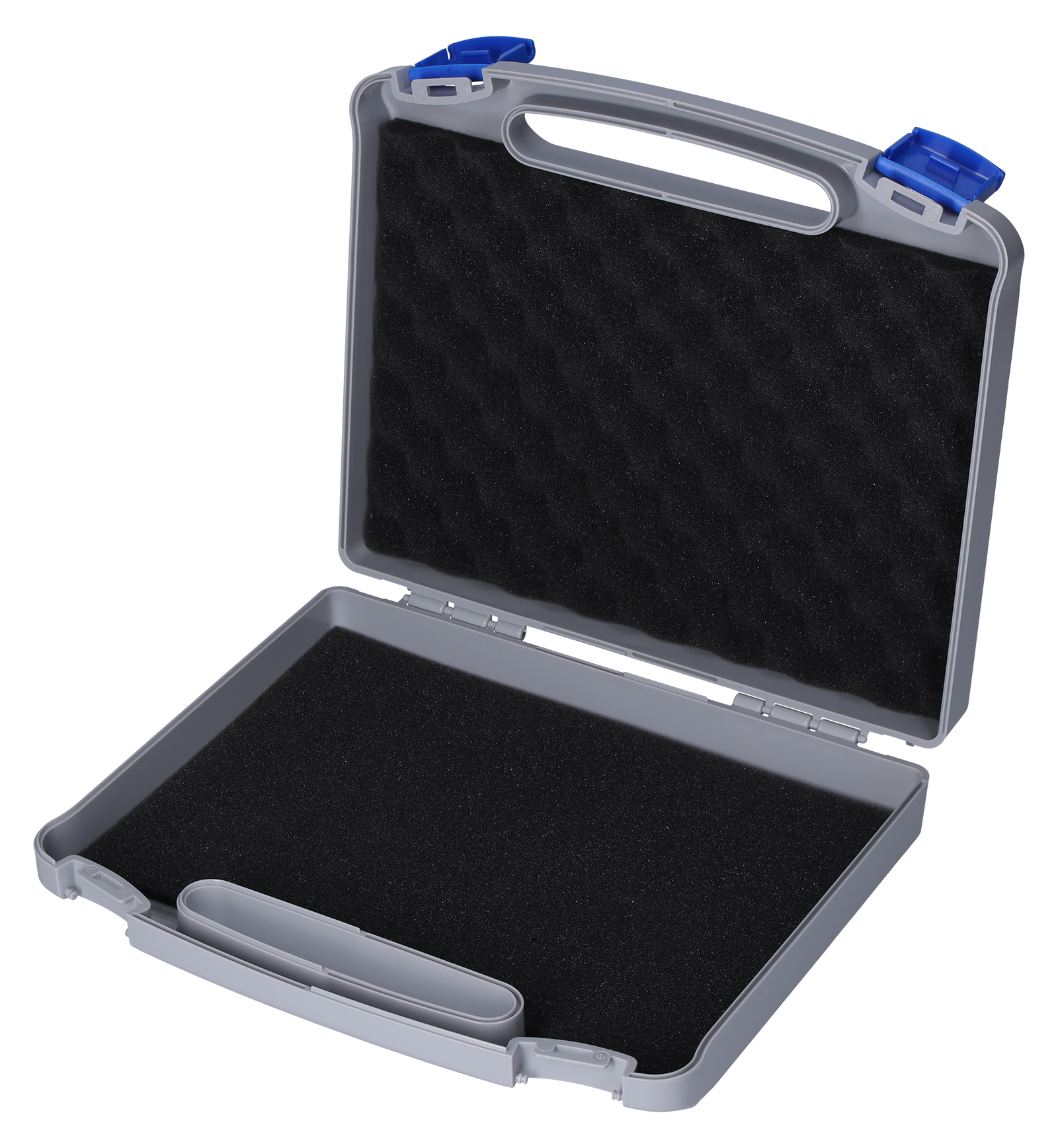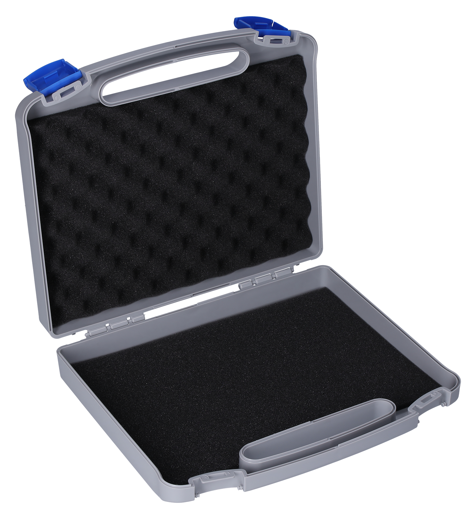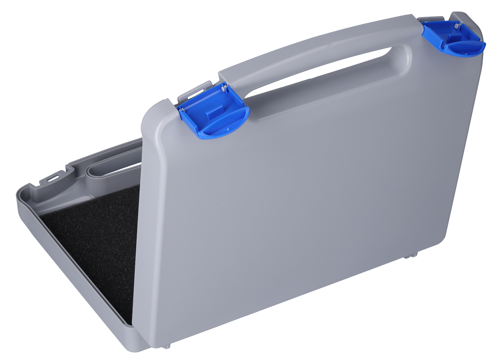 - Koffer grau, mit blauem Verschluss